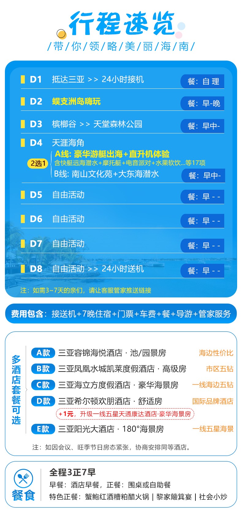 旅游保险:海南旅行社责任险(最高保额10万元/人)。强烈建议游客自行购买旅游意外险